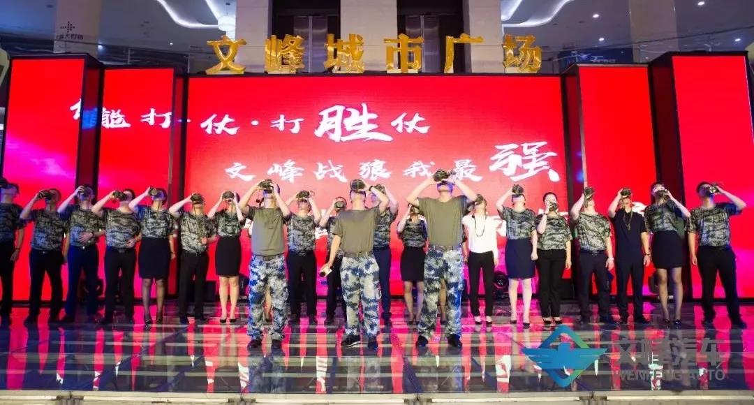最后,文峰汽車總裁、各門店負責人再次上臺,帶領銷售精英共同飲下出征酒,激昂地喊出“能打仗,打勝仗。文峰戰狼我最強”的口號,瞬間點燃了各位精英的戰斗激情,現場再次沸騰。